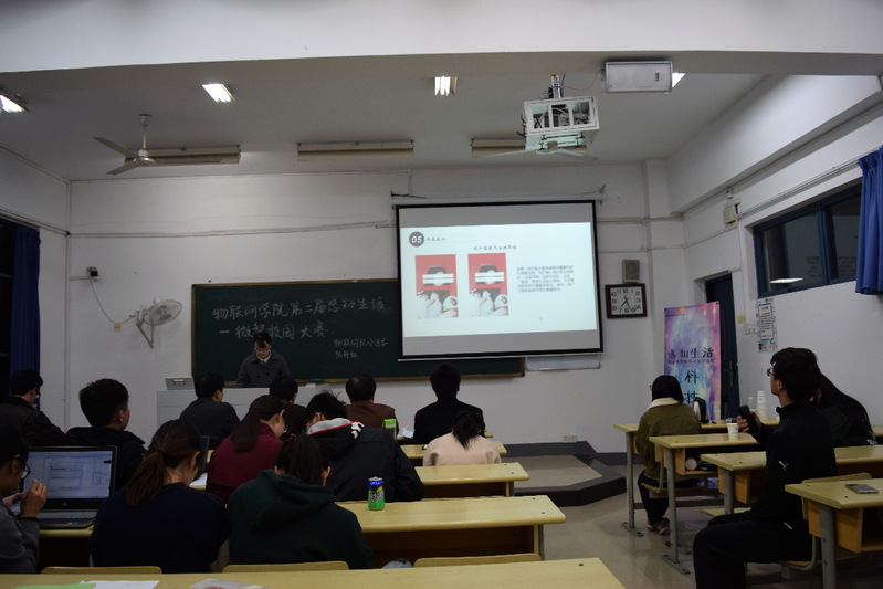 决赛于18:30准时开始,参赛选手依次上台展示自己的创意设计或创新应用作品,作品大都立足于校园生活,以亲身感受的问题作为导向展开深入研究。其中,“基于电容传感器的身份核实及教室调配系统”及“基于南邮小程序的教室导航及预约系统”,从教室的整改与革新入手,使教室分配冗杂费时的问题得到了更有效的解决;“基于网络平台的智慧食堂用餐优化系统”、“基于树莓派的智能宿舍系统的设计与体现”以及“基于蓝牙iBeacon的超市导购系统”,则取材于日常生活,意在提升生活品质;而作品“火流星自动监测站”、“基于传感器--无线通信模型的传统行业升级系统”、“基于机器视觉的云智能监控系统”,取材更为广泛,也反映出同学们对于行业发展趋势的认知与关注。