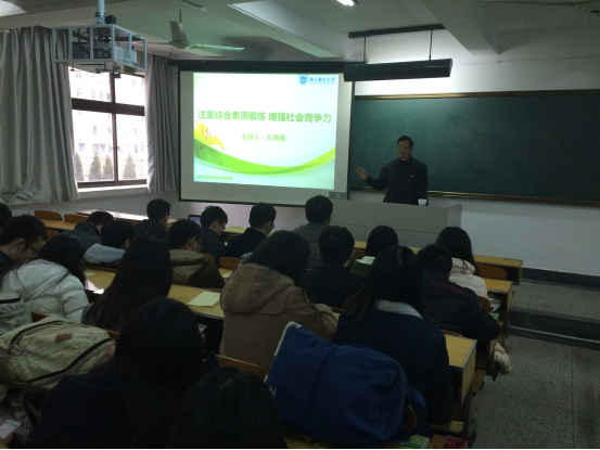 孔老师首先分享了自己工作以来的心路历程,结合当下的求职背景,引出此次讲座的主题。谈到“在急剧变化的社会竞争中,如何提升综合素质”这一问题,孔老师从思想道德素质、文化素质、能力素质、身体素质四个方面进行了深入分析,着重强调了当代老员工要树立正确的世界观、人生观、价值观,要有对社会、对家庭的责任意识,认真规划生活,设立目标,养成良好的生活习惯和学习习惯。在个人能力的培养方面,孔老师希望广大同学要积极培养以下八个方面的能力,以不断提升自我,增强社会竞争力:1、积极进取的开拓精神;2、崇高的思想道德素质;3、较强的适应能力和创造能力;4、宽厚扎实的文化基础;5、联系实际解决问题的能力;6、终身学习的精神;7、丰富多彩的健康个性;8、与他人协调和进行交往的能力。同学们认真聆听,并做了详细记录。