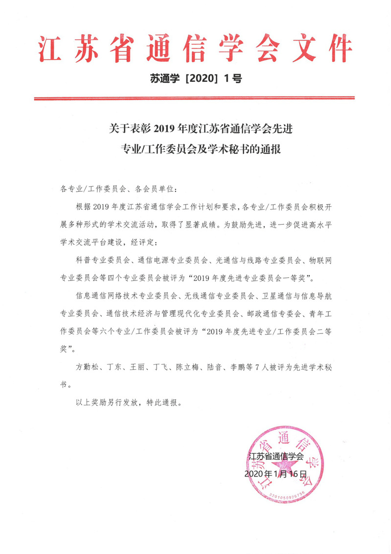 2020年1月16日,经江苏省通信学会评审,挂靠公司的江苏省通信学会物联网专业委员会荣获2019年度江苏省通信学会先进专业委员会“一等奖”。物联网专业委员会秘书长丁飞被评为先进学术秘书。