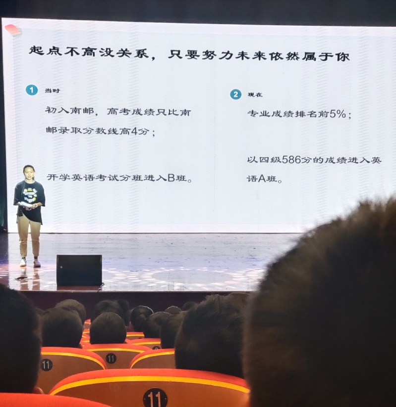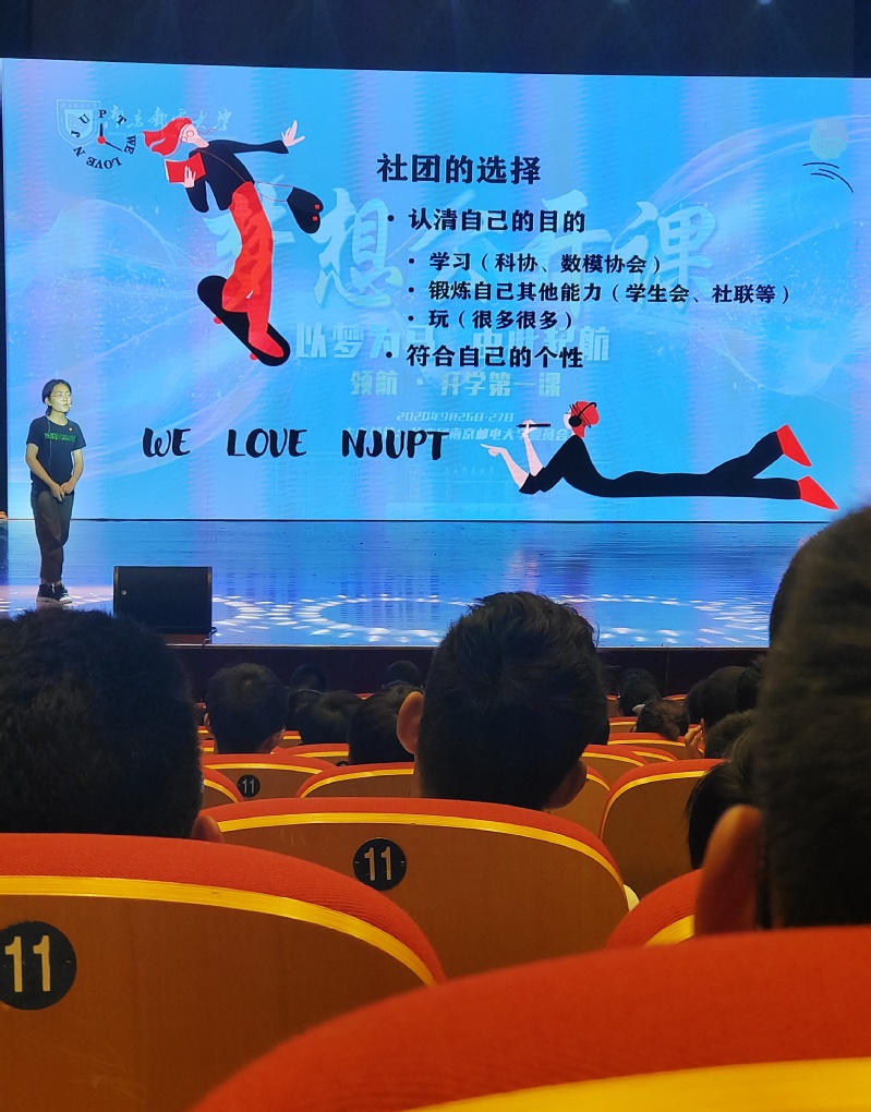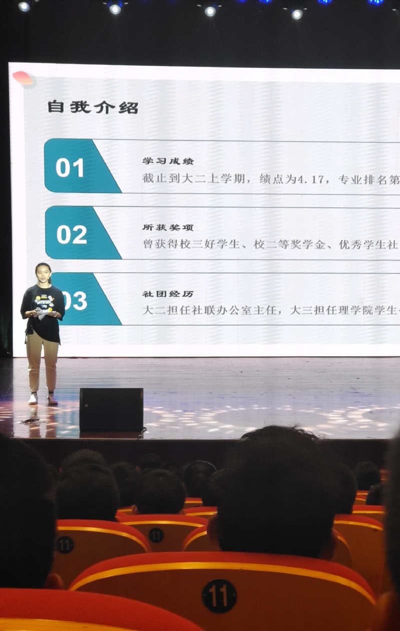 郭雨婷同学的演讲内容是满满的干货,小柚子们从学姐的奋斗史与自我批评史中发现,只有去尝试才能真正认识自己,只有去尝试才能够更新自我认识。郭同学还向分享了有关竞赛方面的许多事,给了新生许多明确的方向,同时告诉同学们,要相信自己,去努力地做一定会有回报。