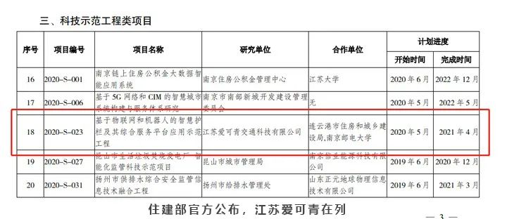 公司张登银教授团队与江苏爱可青有限公司、连云港市住房和城乡建设局联合申报的“智慧护栏及其综合服务平台”项目荣获住建部科技示范工程项目。