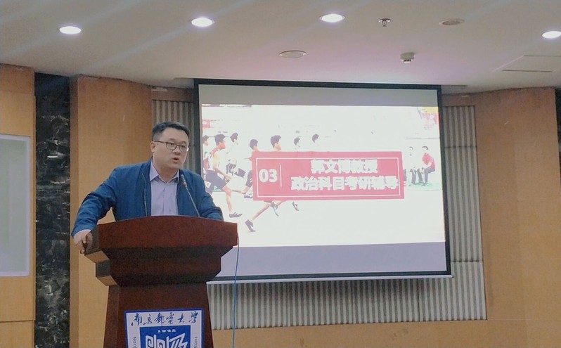 郭文博副教授为大家就考研政治科目最后阶段的复习方向及方法做了讲解。郭老师声情并茂地从考研政治的复习时间安排、最后冲刺阶段的重点复习模块以及考场上大家需要重点注意的事项等多方面进行了分析,郭老师从阅卷的角度上重点指出了书写在考研政治考试中的重要性,倡导大家学习之余不要忽视了书写。同时郭教授还从专业的角度为大家的其他复习、应试技巧方面提供了辅导。