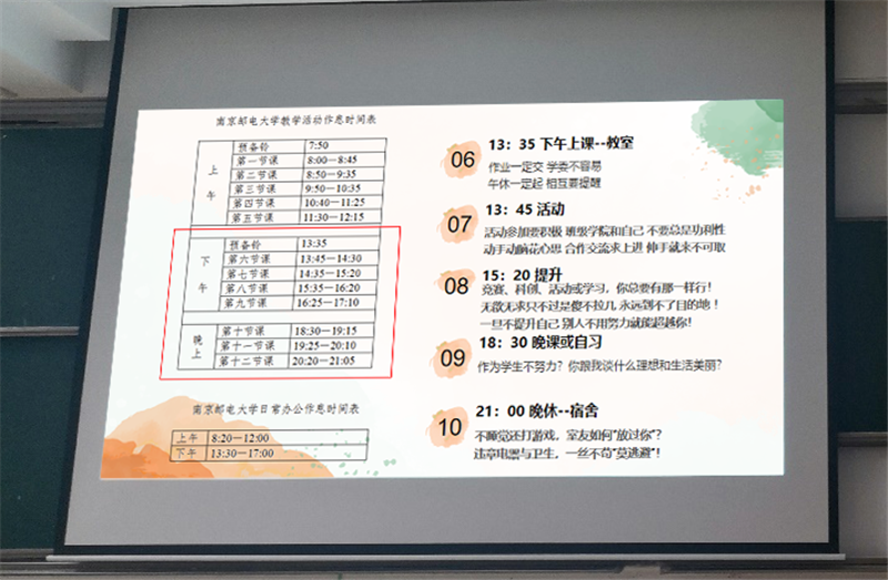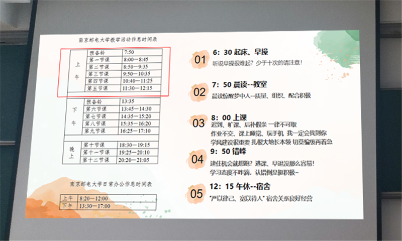 活动伊始,王老师以南邮教学活动作息时间表为主线,用生动幽默的方式进行前期总结,从早起晨跑到课堂学习,学风建设到寝室生活,理想信念到个人提升等,呼吁大家“严于律己,宽以待人”,注重全面发展。对大家在各方面提出了明确的要求,并强调在每个阶段都有必须完成的任务和追求的目标,才应该是每位同学的常态。