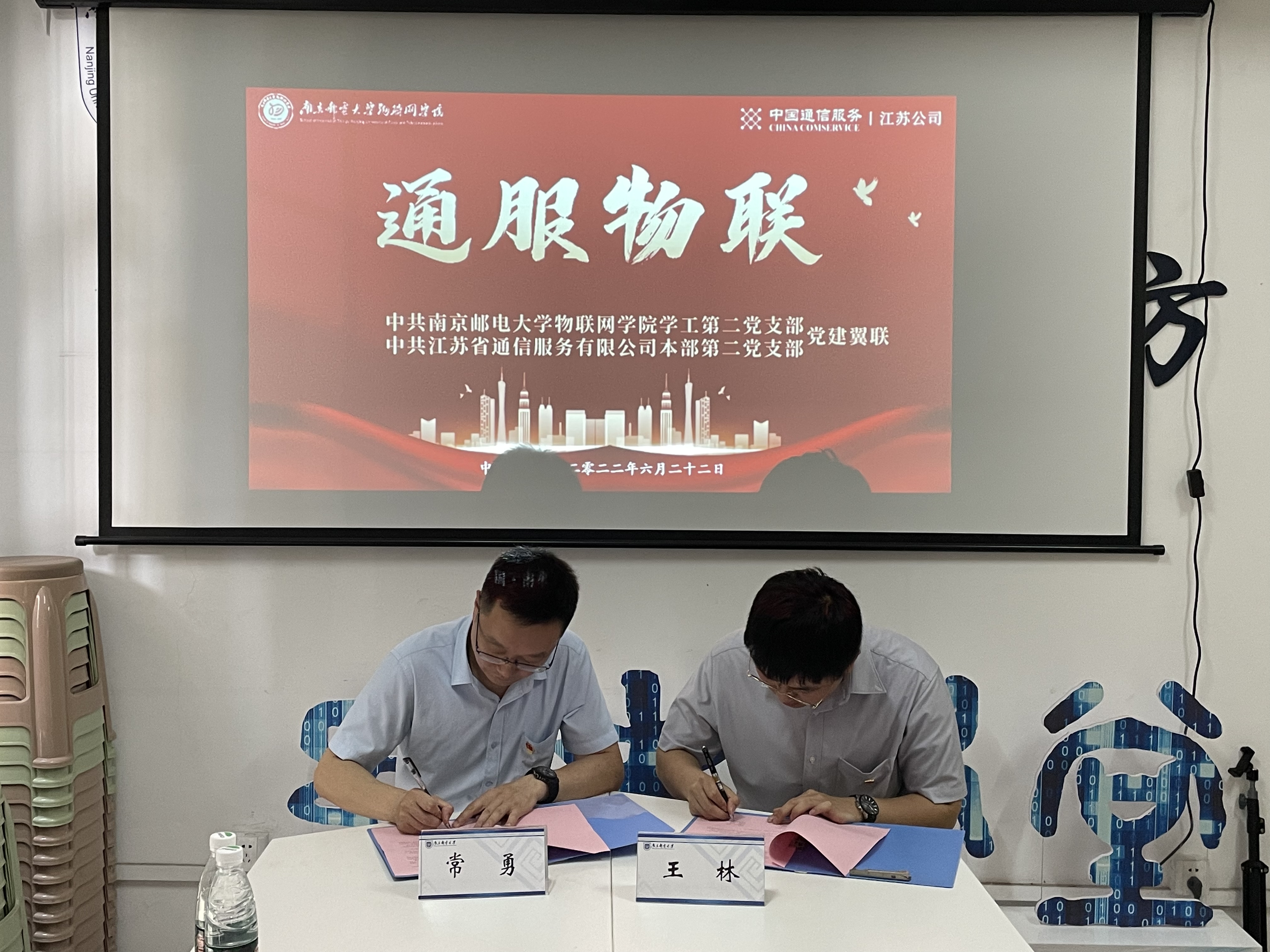 为深入学习贯彻习近平新时代中国特色社会主义思想,落实新时代党的建设要求,充分发挥基层党支部的主体作用,激发党员的活力,6月22日下午,BETWAY必威学工第二党支部与江苏省通信服务有限公司本部第二党支部在仙林校区物联网公司党员工作站开展“通服物联”党建翼联合作共建签约仪式,江苏省通信服务有限公司本部第二党支部书记常勇、纪检委员徐忠勇、宣传委员季立,物联网公司党委书记邓艳华、BETWAY必威学工二支部书记王林、副书记赵珂、师生党员代表参加活动,活动由物联网公司党委副书记、副经理徐欣娅主持。
