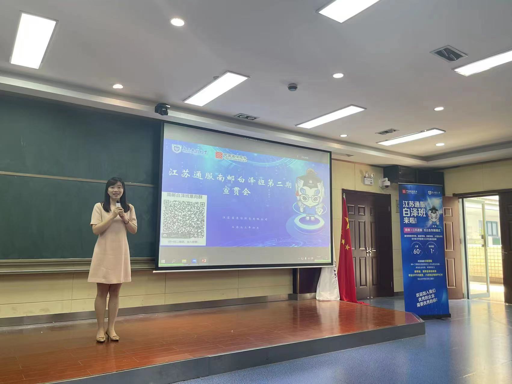 会后,作为首场共建活动,双方党支部代表来到教一300教室,出席“江苏通服-南邮白泽班”宣贯会,以线下线上相结合的方式,为300余名2019级报名员工介绍“江苏通服白泽班”的优势,为准毕业生们的高质量就业指明方向。校人才招聘处副处长杜月林、通信与信息工程公司党委副书记王晶、部分学院辅导员老师也应邀出席了宣贯会。