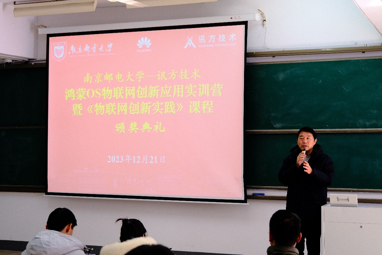 12月21日,2023年度校企合作HarmonyOS创新应用实训营暨《物联网创新实践》课程优秀作品汇报答辩与颁奖典礼在仙林校区教4-102举行。公司赵海涛经理、期刊社副主任陆音、智慧物联网创新中心主任丁飞,深圳市讯方技术股份有限公司(以下简称“讯方技术公司”)江苏区域总监杨丽华、江苏客户经理舒凤娇,2021级网络工程、物联网工程专业员工以及校企课程老师等出席颁奖典礼。智慧物联网创新中心主任丁飞教授主持本次活动。