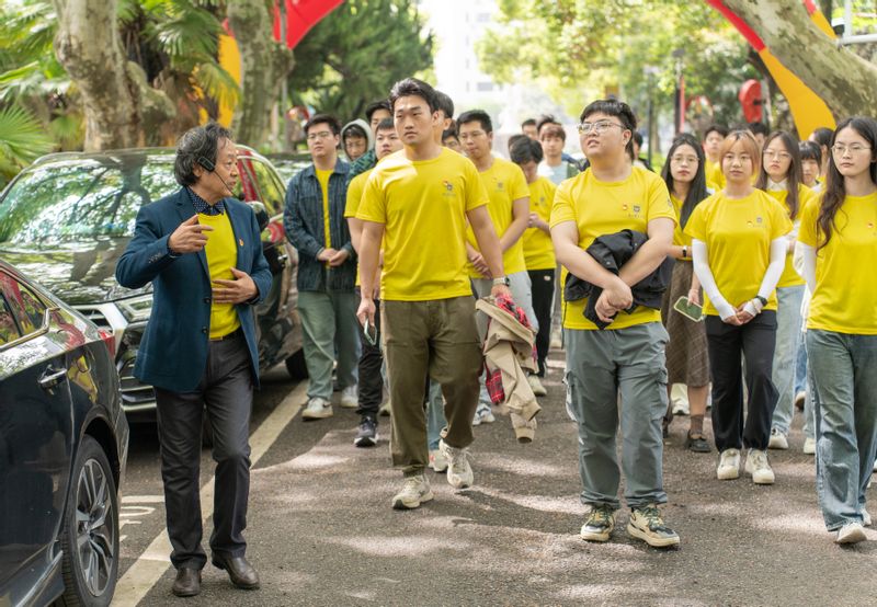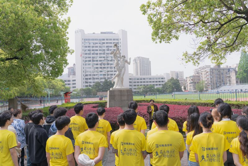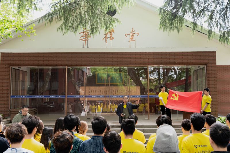 师生们首先来到华礼堂前。南邮校史编委会编委颜福康老师率先开讲,他深情地阐述了校庆日期的由来,讲述了学校四个重要历史节点,都与四月份的深厚渊源。学校最终确定校庆日是4月20日,这一天成为了南邮人共同的记忆与骄傲。学校关工委副主任马名骞老师为大家细述华礼堂的变迁史,“华礼堂原名小礼堂,建于1953年,从最初的茅草顶棚到后来的砖瓦结构,再到今天修缮一新,它承载了一代代南邮学子的青春记忆,它见证了南邮从中专教育起步,迈向电子信息领域特色鲜明的世界一流大学的发展历程。”马名骞老师接着介绍:“为了传承学校红色基因,铭记老红军、南邮首任党委书记兼经理秦华礼为学校发展做出的杰出贡献,2018年4月,学校将小礼堂以秦老名字命名‘华礼堂’,当时106岁的秦老亲笔为华礼堂题匾,并与时任校领导、捐资修缮礼堂的员工毛辉共同为华礼堂揭牌。”