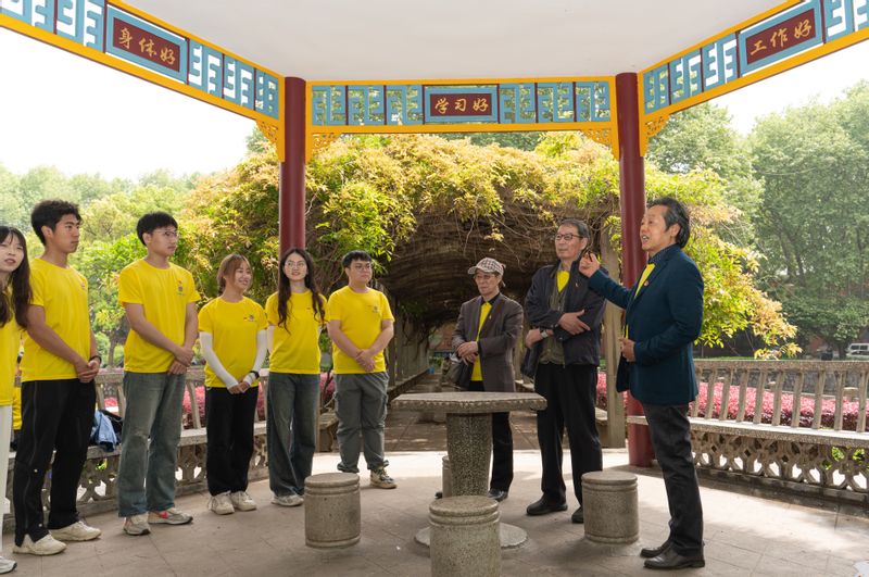 1978年毕业于南邮,留校任教的张少武教授,是学校多处网红打卡点的设计者。张少武教授和青年师生一起漫步校园,他指着前方说道,这是1956年长市机专科等5个毕业班170名同学为报答母校,献建的红柱六角茅顶的“三好亭”,1996年改用钢筋水泥翻建。走到“三好亭”旁边的眼镜湖边,张少武教授深情回忆了师生们共同参与建设的情景,员工挖池塘,老师打磨护栏,齐心协力改变了原来淤泥发臭、杂草丛生的状况,才有了如今荷花竞相开放的“眼镜湖”。“南邮具有光荣的革命传统,自力更生就是其中之一,师生积极奉献,共同把学校建设得越来越好。”张少武教授认为,校园环境建设也要围绕“培养人”,他设计的四方亭,寓意南邮的员工来自五湖四海,又从南邮走向国家建设的四面八方。在四方亭的旁边,还建了一座晨读的雕塑。
