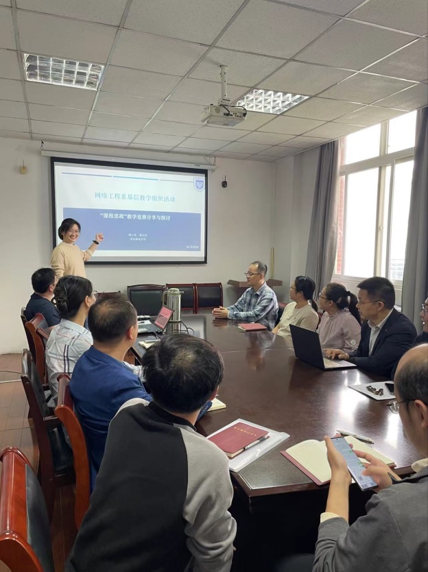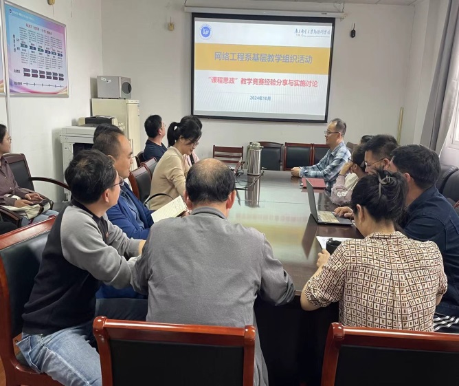 2024年10月16日下午网络工程系在三牌楼校区召开基层教学组织活动,本次活动的主题是:“课程思政”教学竞赛经验分享与实施讨论。会议由系主任朱云霞老师主持,系全体教师参加。