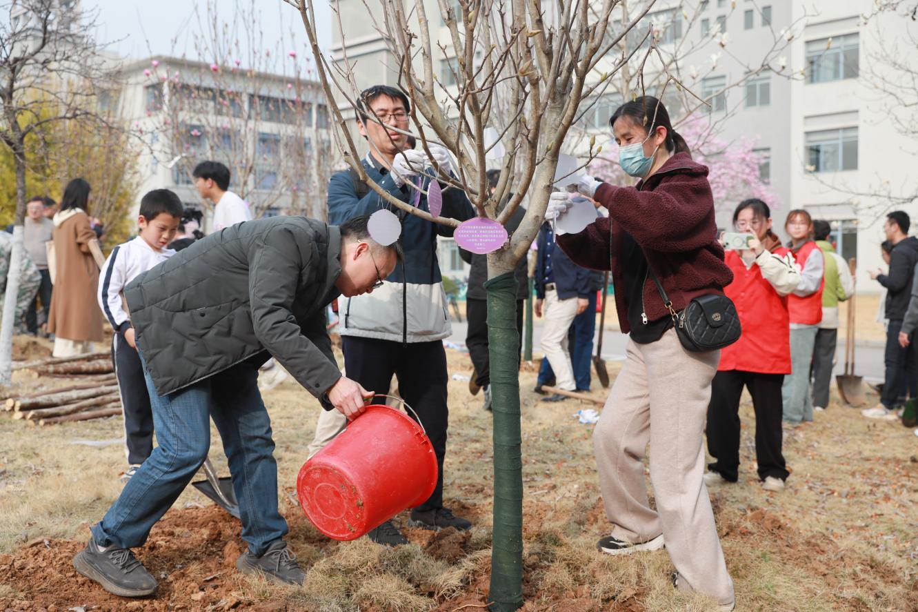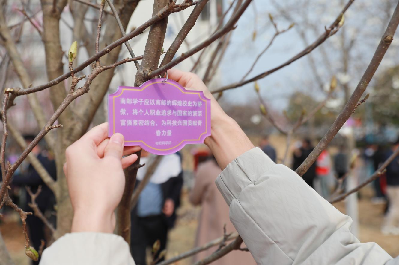 伴随着深情而激昂的合唱歌声,校领导与共建单位党员们三两成组,领取工具、栽植树苗。大家分工协作,俯身挖坑、扶苗填土、提桶浇灌,为玉兰树系上刻有励志寄语色标识牌。每一个动作都细致入微,每一道工序都井然有序,在欢声笑语中,一棵棵紫玉兰树苗稳稳地在南邮校园“安家”,“党建共建先锋林”落地生根,为这片土地注入了新的生机与希望。